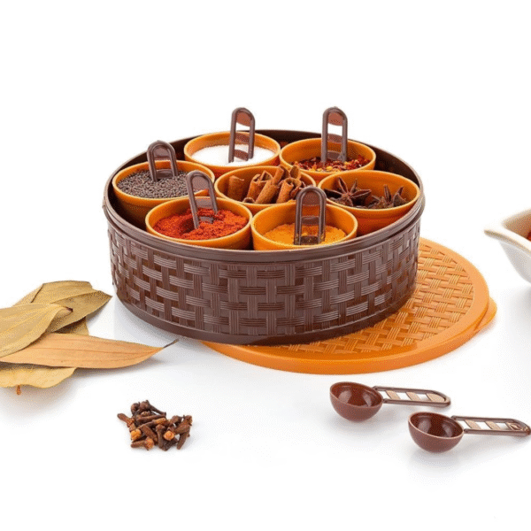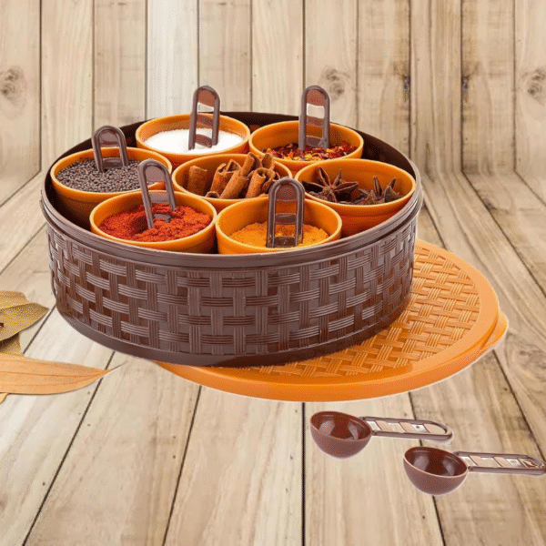 Built from high-quality, BPA-free, food-grade virgin plastic, this masala box is lightweight, durable, and safe for daily use. Its dual-tone woven design with a contrasting brown lid enhances your kitchen’s aesthetic appeal while ensuring hygiene and functionality.