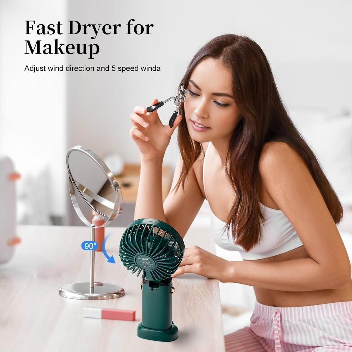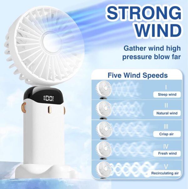 This handheld mini fan offers five adjustable wind speeds, allowing you to customize airflow according to your comfort level. Whether you need gentle air circulation indoors or stronger cooling outdoors, the multiple speed settings ensure the perfect breeze.