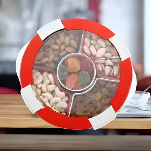 This spice container features five outer compartments along with a center section, making it ideal for organizing different spices and condiments. As a result, ingredients remain separated and neatly arranged.